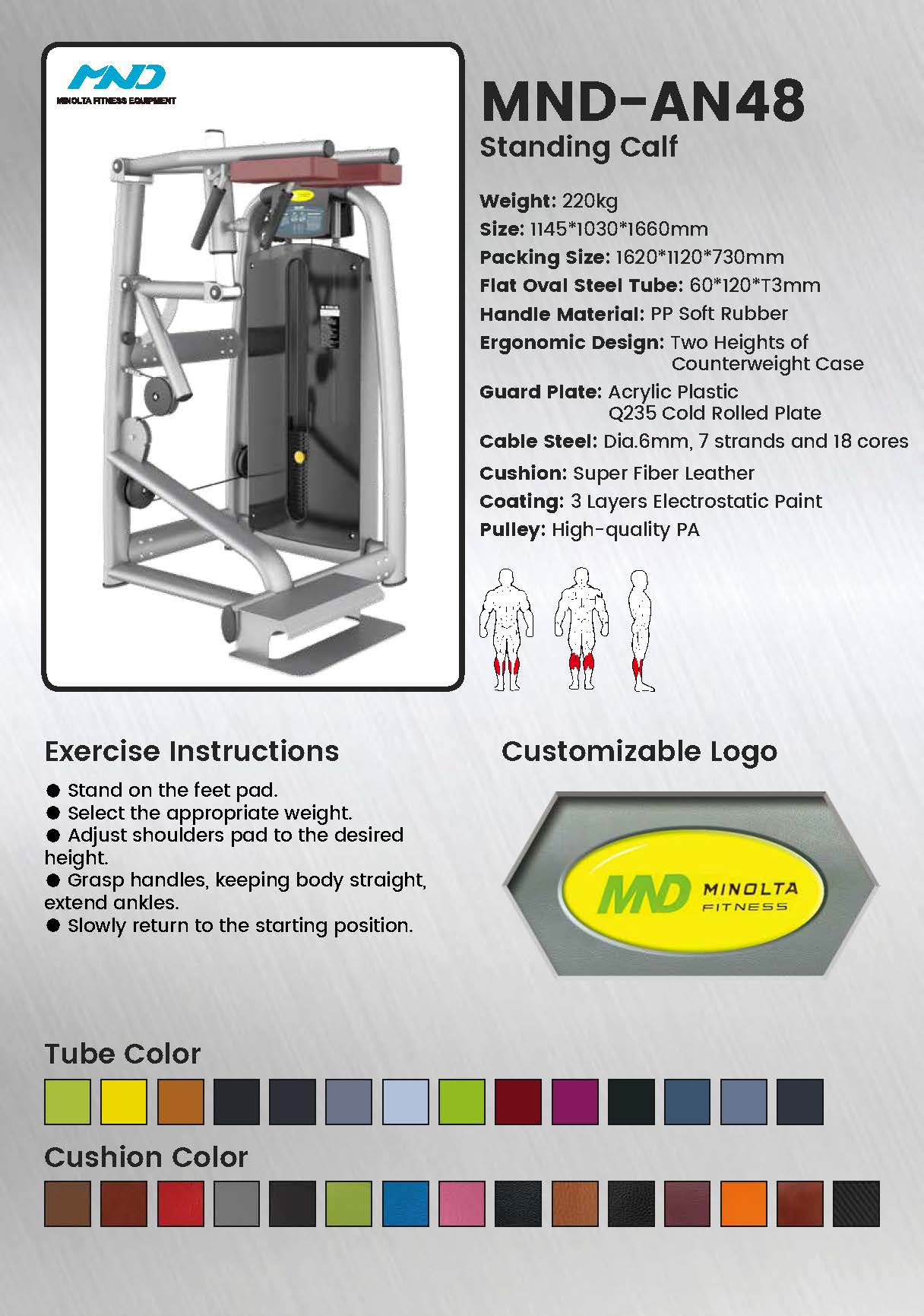 يتميز جهاز AN48 بنظام تحميل عمودي دقيق يحافظ على التوتر المستمر على عضلات الساق طوال نطاق الحركة الكامل. توفر وسادات الكتف القابلة للتعديل ومنصة القدم المضادة للانزلاق وضعًا آمنًا للتدريب المكثف على ربلة الساق.