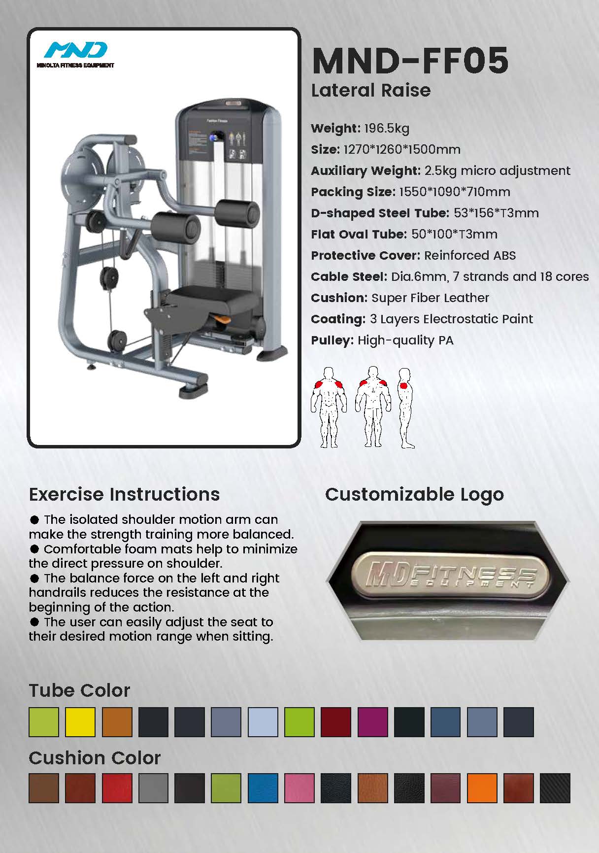 ارفع منطقة تدريب كتفك مع FF05. تقوم آلة ضغط الكتف المخصصة هذه بتوجيه الوزن عموديًا، مما يعزل العضلات الدالية مع تثبيت القلب، وهو مثالي لبناء حجم الكتف وقوته بشكل لا تشوبه شائبة. تعمل بصمة القدم المدمجة على زيادة كفاءة مساحة صالة الألعاب الرياضية الخاصة بك.