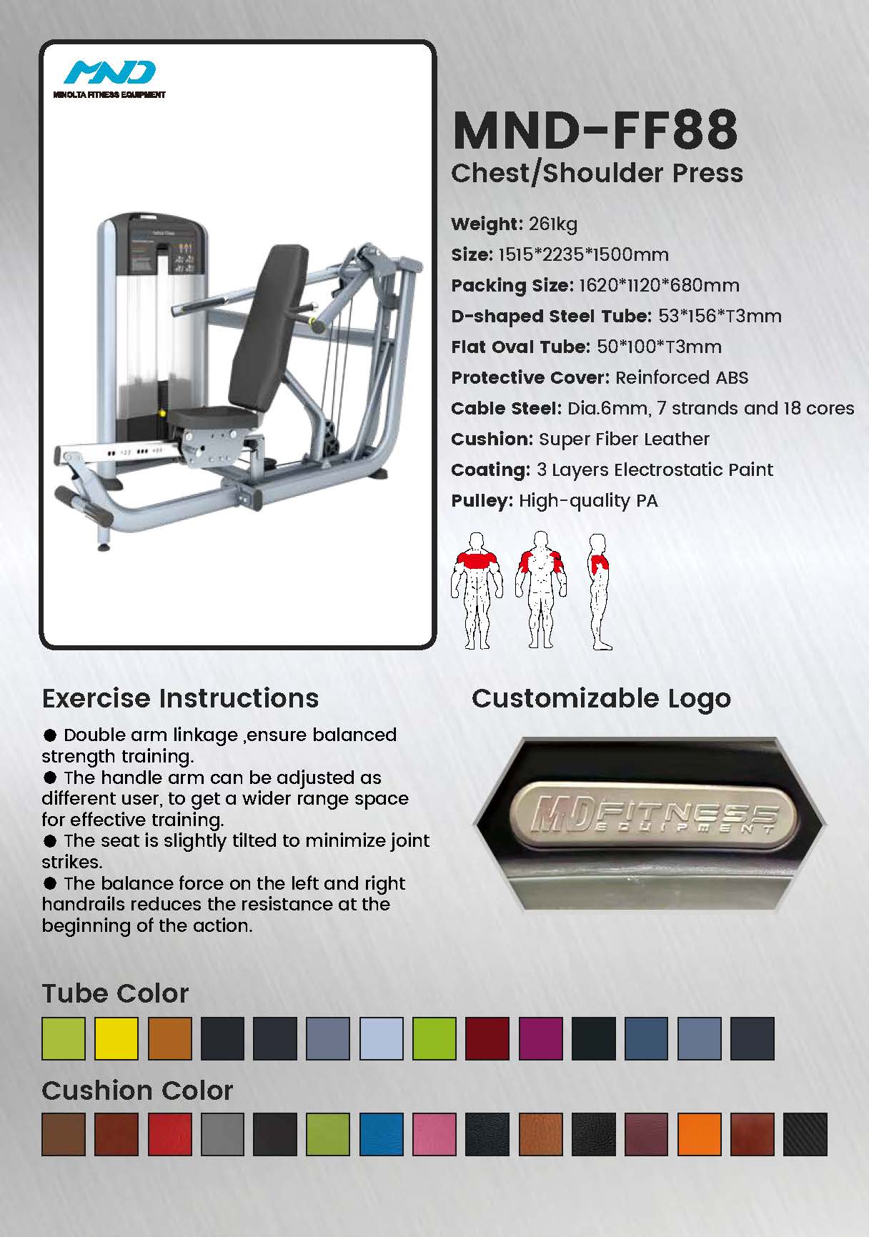 تم تصميم MND-FP88 لتدريبات القوة الجادة. يضمن تركيبه القوي ومسار الحركة الدقيق تدريبات فعالة وآمنة لبناء كتلة الصدر والكتف، مما يجعله حجر الزاوية في أي منطقة تدريب للجزء العلوي من الجسم.
