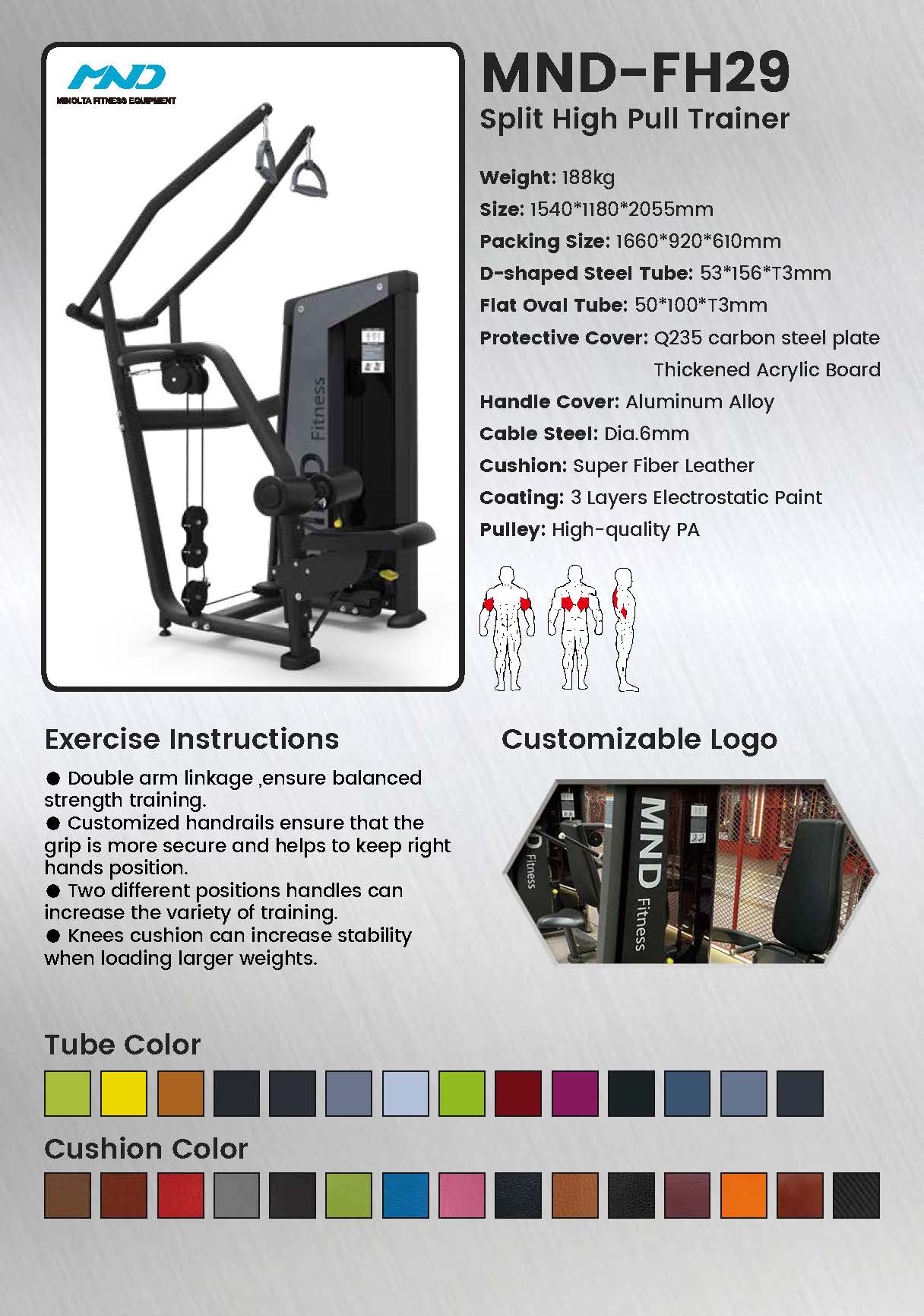 تكوين الجزء العلوي من الظهر قوي ومرن. يستخدم جهاز FH29 أذرعًا مستقلة لمحاكاة التمارين مثل عمليات السحب العالية والصفوف المستقيمة، مستهدفًا العضلات شبه المنحرفة والدالية والعضلات المدورة لتحسين وضعية الجسم وصحة الكتف.
