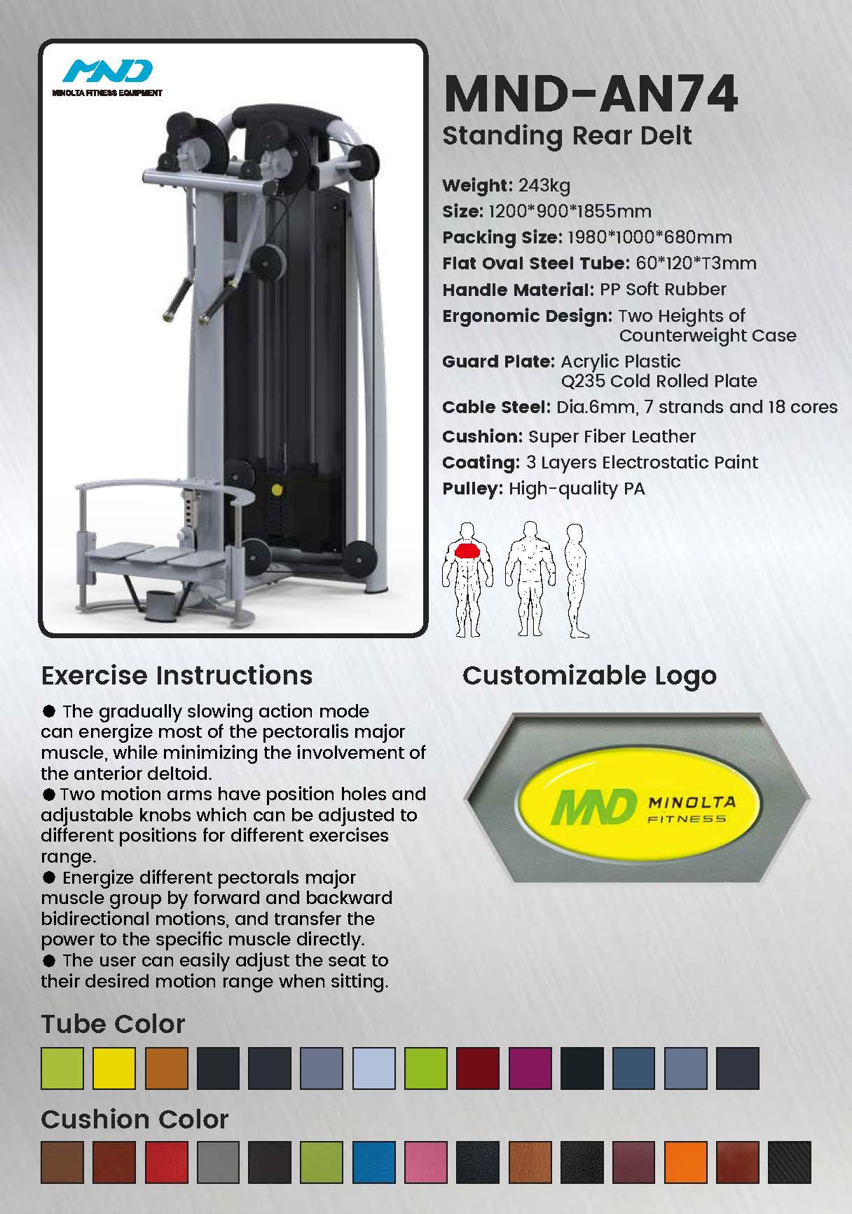 يتميز جهاز AN74 بوضعية الوقوف المتخصصة التي تسمح بحركة الكتف الطبيعية أثناء تدريب العضلة الخلفية. تعمل وسادة الصدر القابلة للتعديل والنظام المحوري الدقيق معًا لتوفير نمو مستهدف للكتف الخلفي.